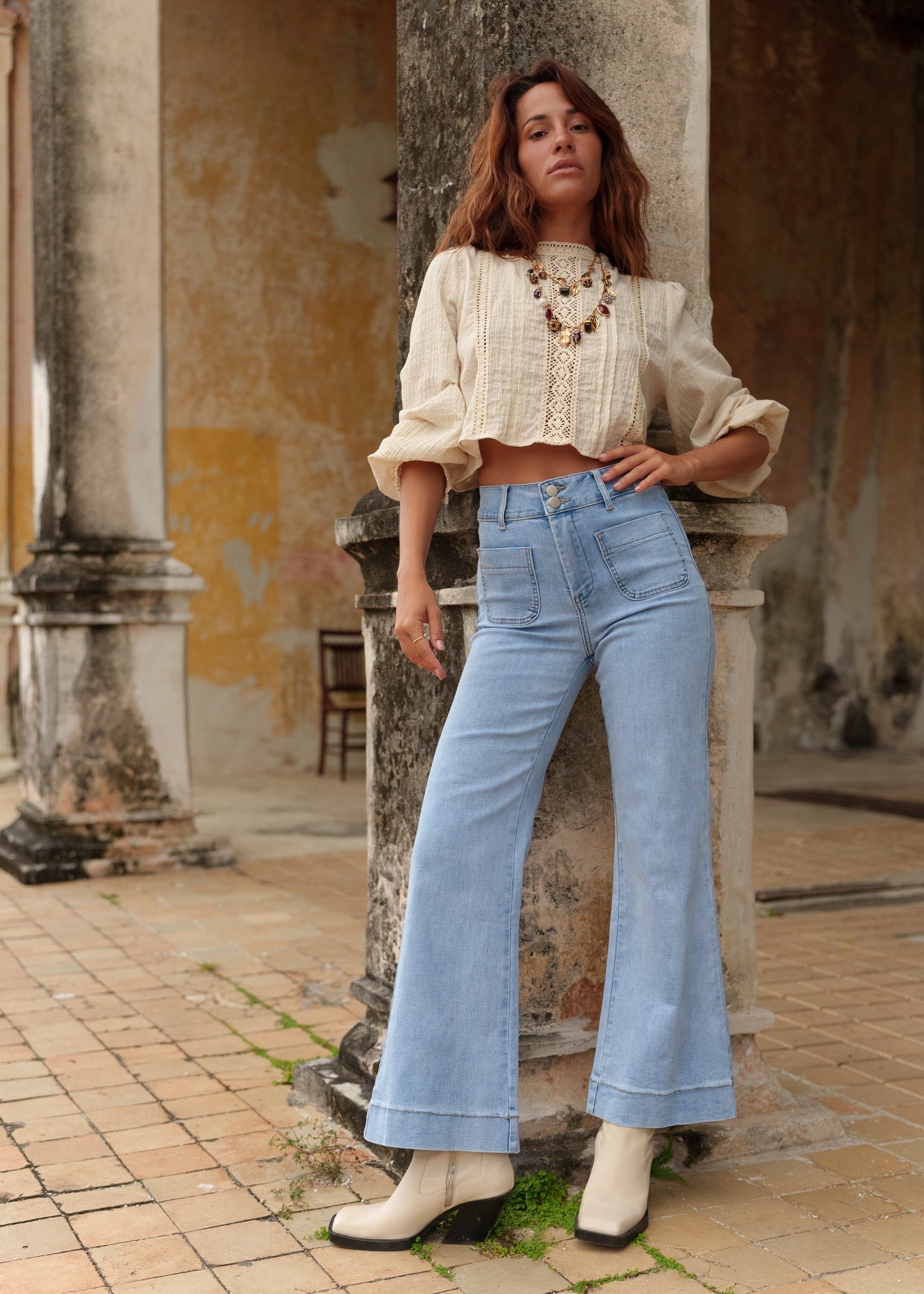 - Victorine : un jean à pont élégant et original, grâce à ses boutons et sa coupe wide cintrée à la taille.