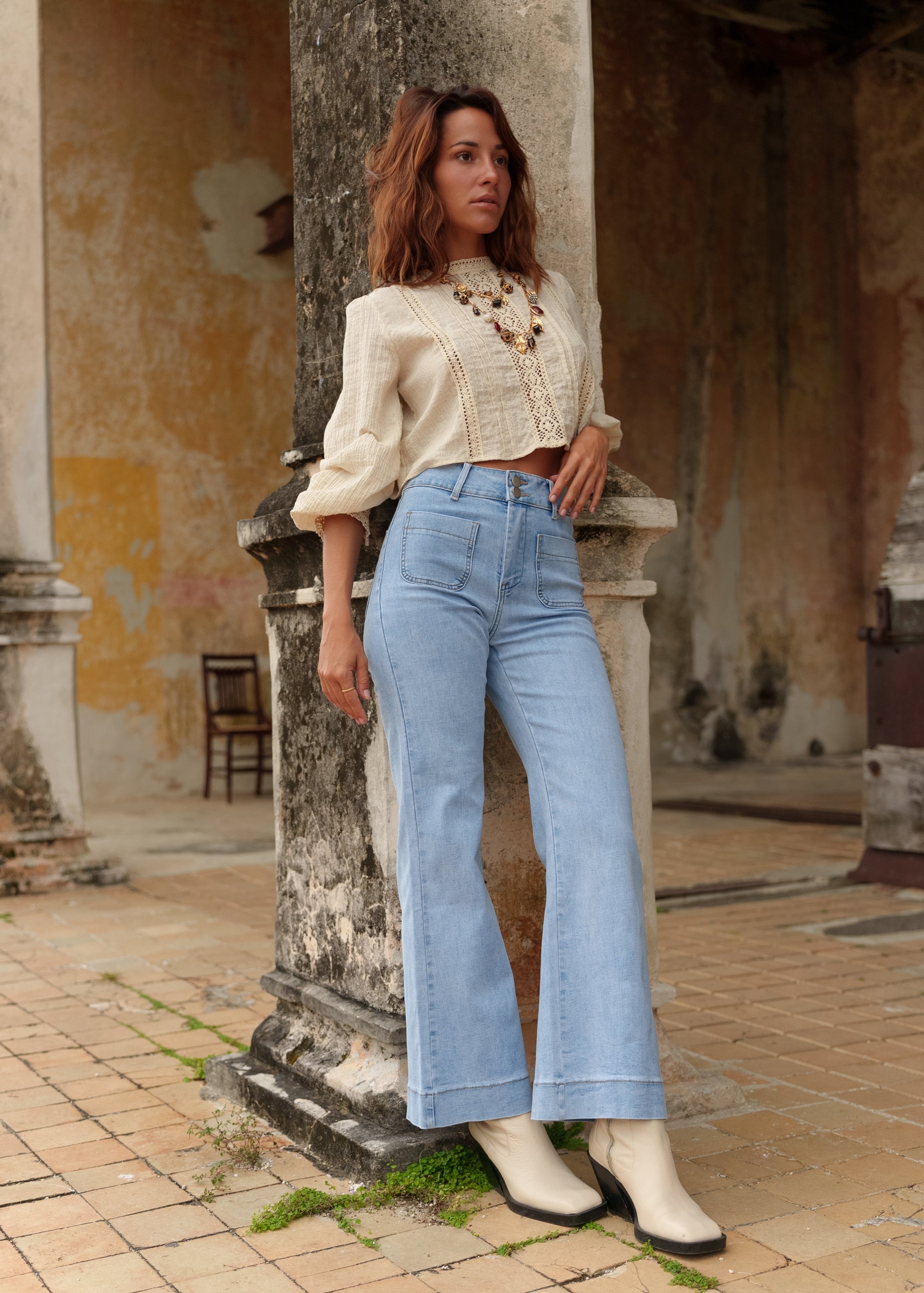 Le jean droit et le jean cigarette conviennent à la majorité des silhouettes. Les coupes flare ou bootcut équilibrent les hanches, tandis que les jeans larges et palazzo apportent une allure moderne et fluide. En cas de doute, nous vous recommandons d’opter pour un jean femme taille haute.