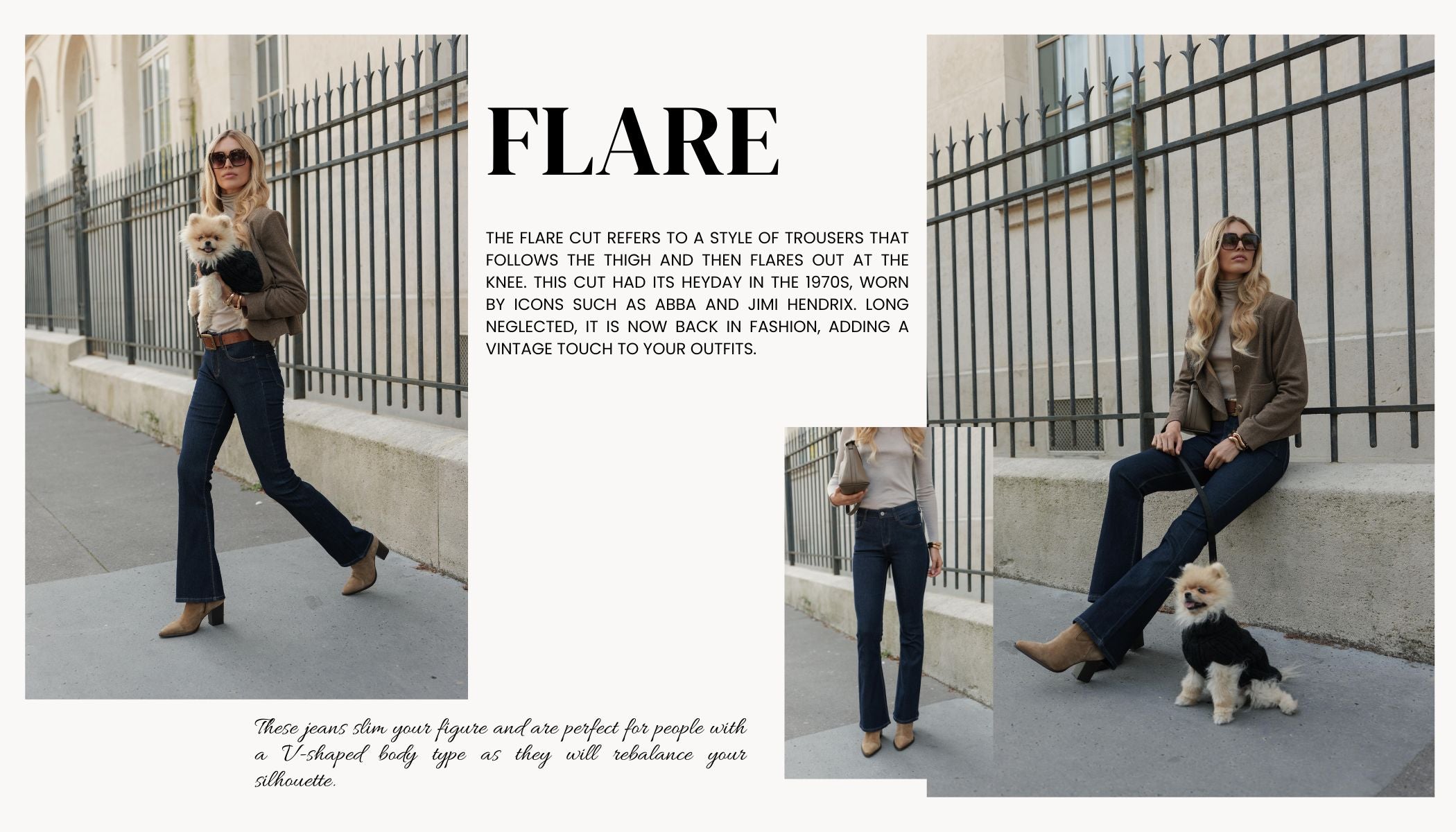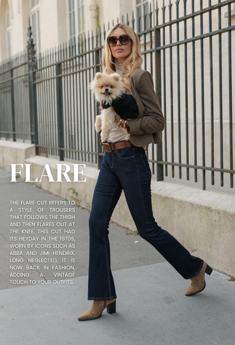 Today, flared jeans are back in the spotlight, adored by all fans of retro chic, they are appreciated for their silhouette-structuring effect. They lengthen the legs, slim the waist, and add an elegant, vintage touch.