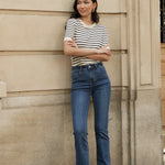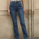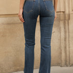 The Bella Jeans have a regular bootcut fit, meaning they are fitted at the thighs and buttocks and then slightly flared at the bottom of the silhouette.