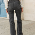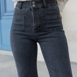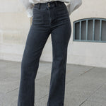 The Elena jeans are a wide flare cut, meaning they will follow the thigh (without sticking to it) and then flare out at the knee. The Elena jeans are the long version of the Elenette .