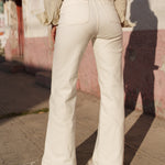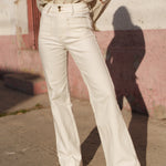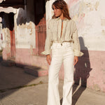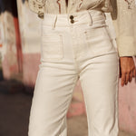 The Elena jeans are a wide flare cut, meaning they will follow the thigh (without sticking to it) and then flare out at the knee. The Elena jeans are the long version of the Elenette .