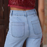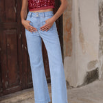 The Elena jeans are a wide flare cut, meaning they will follow the thigh (without sticking to it) and then flare out at the knee. The Elena jeans are the long version of the Elenette .