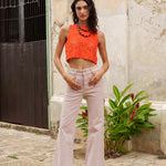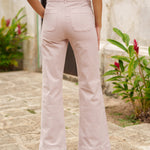 The Elena jeans are a wide flare cut, meaning they will follow the thigh (without sticking to it) and then flare out at the knee. The Elena jeans are the long version of the Elenette .
