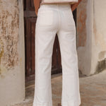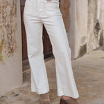 The jean Elenette is a wide flare cut, meaning it will follow the thigh (without sticking to it) then flare out at the knee. The Elenette is the shorter version (for petite women) of the Elena .
