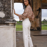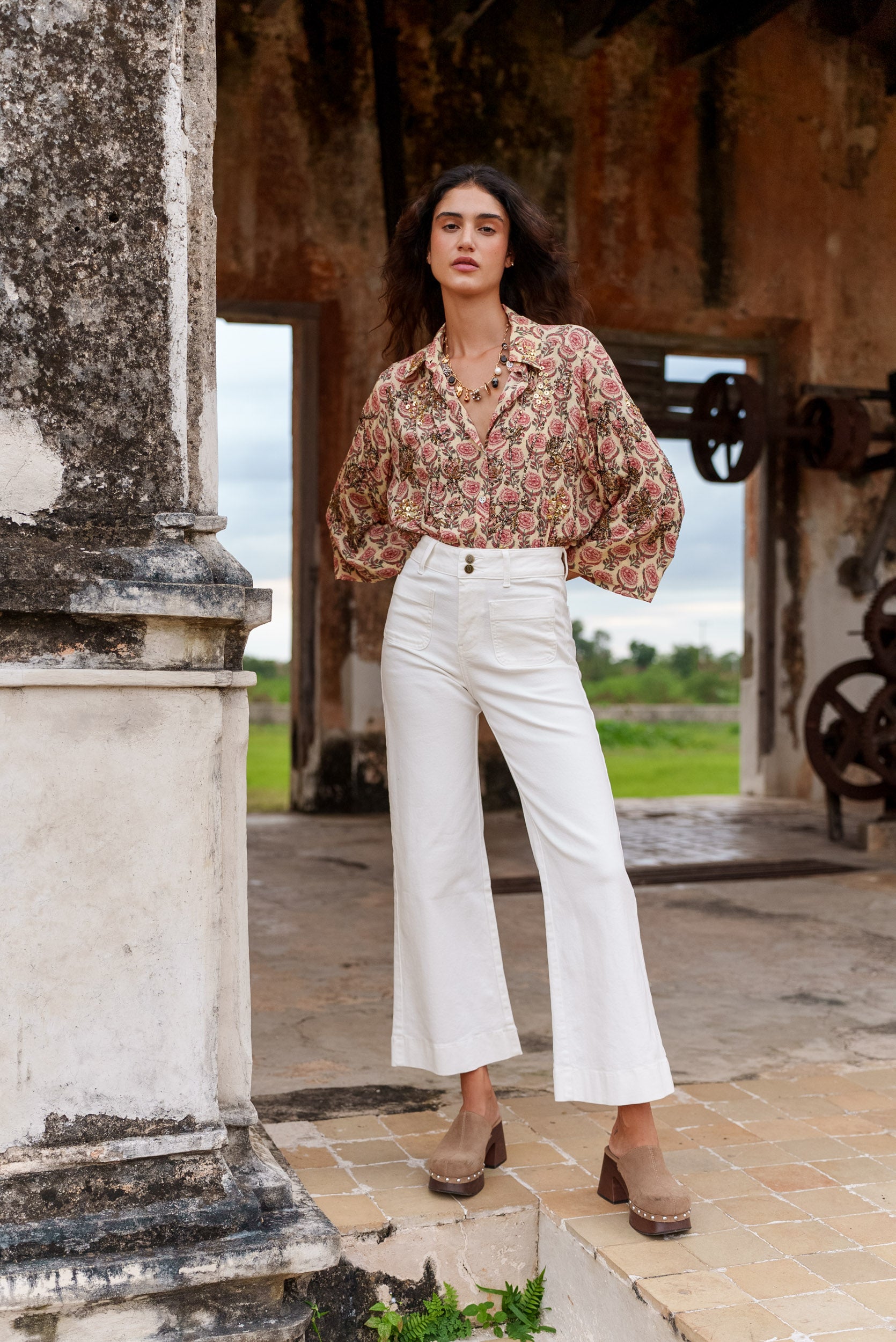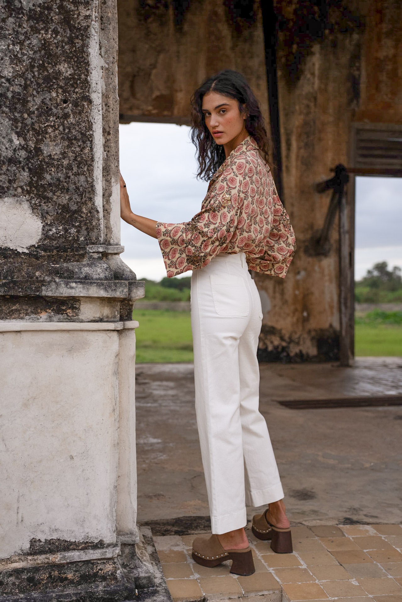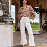 The jean Elenette is a wide flare cut, meaning it will follow the thigh (without sticking to it) then flare out at the knee. The Elenette is the shorter version (for petite women) of the Elena .