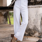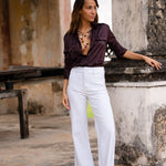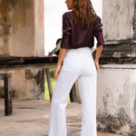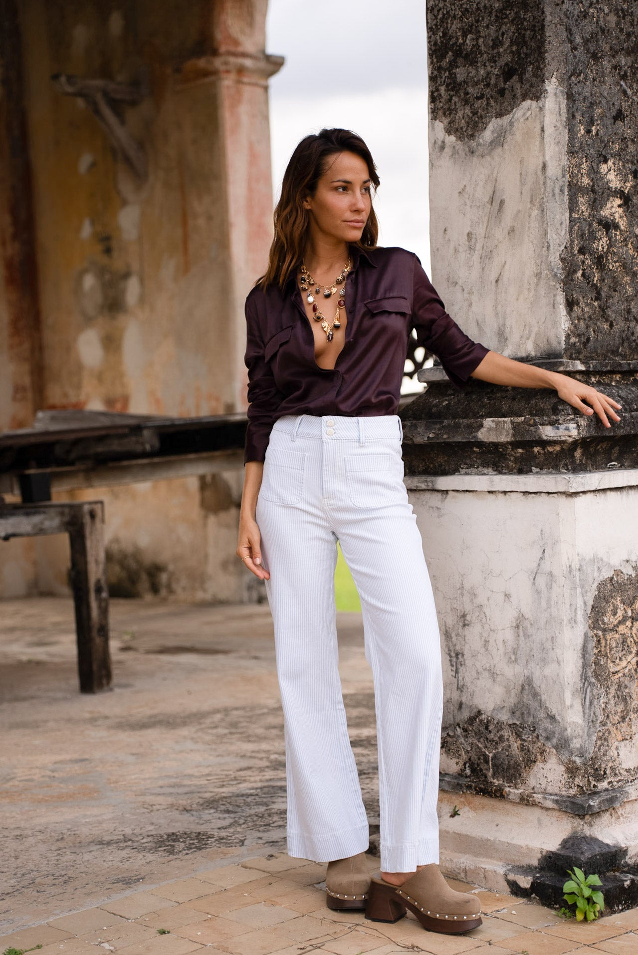 The jean Elenette is a wide flare cut, meaning it will follow the thigh (without sticking to it) then flare out at the knee. The Elenette is the shorter version (for petite women) of the Elena .
