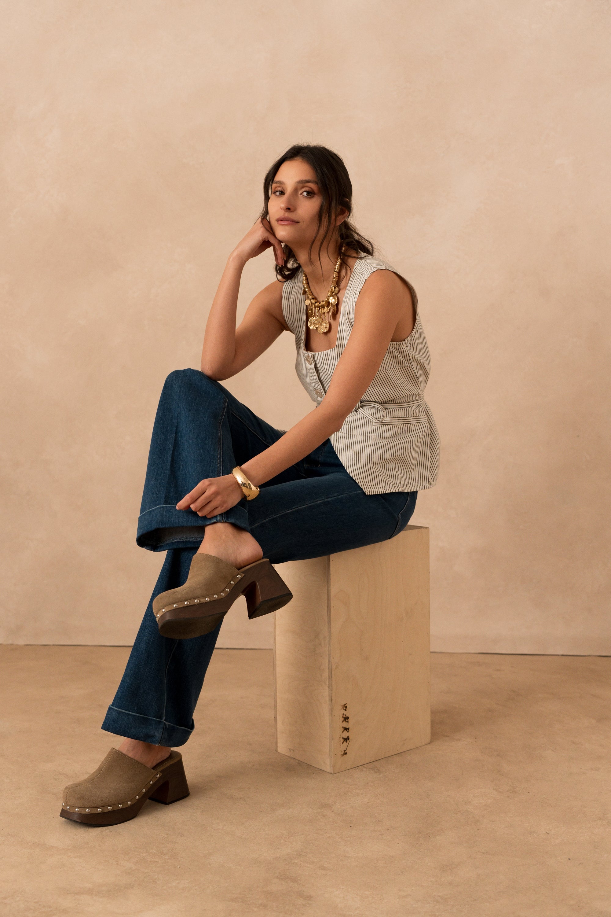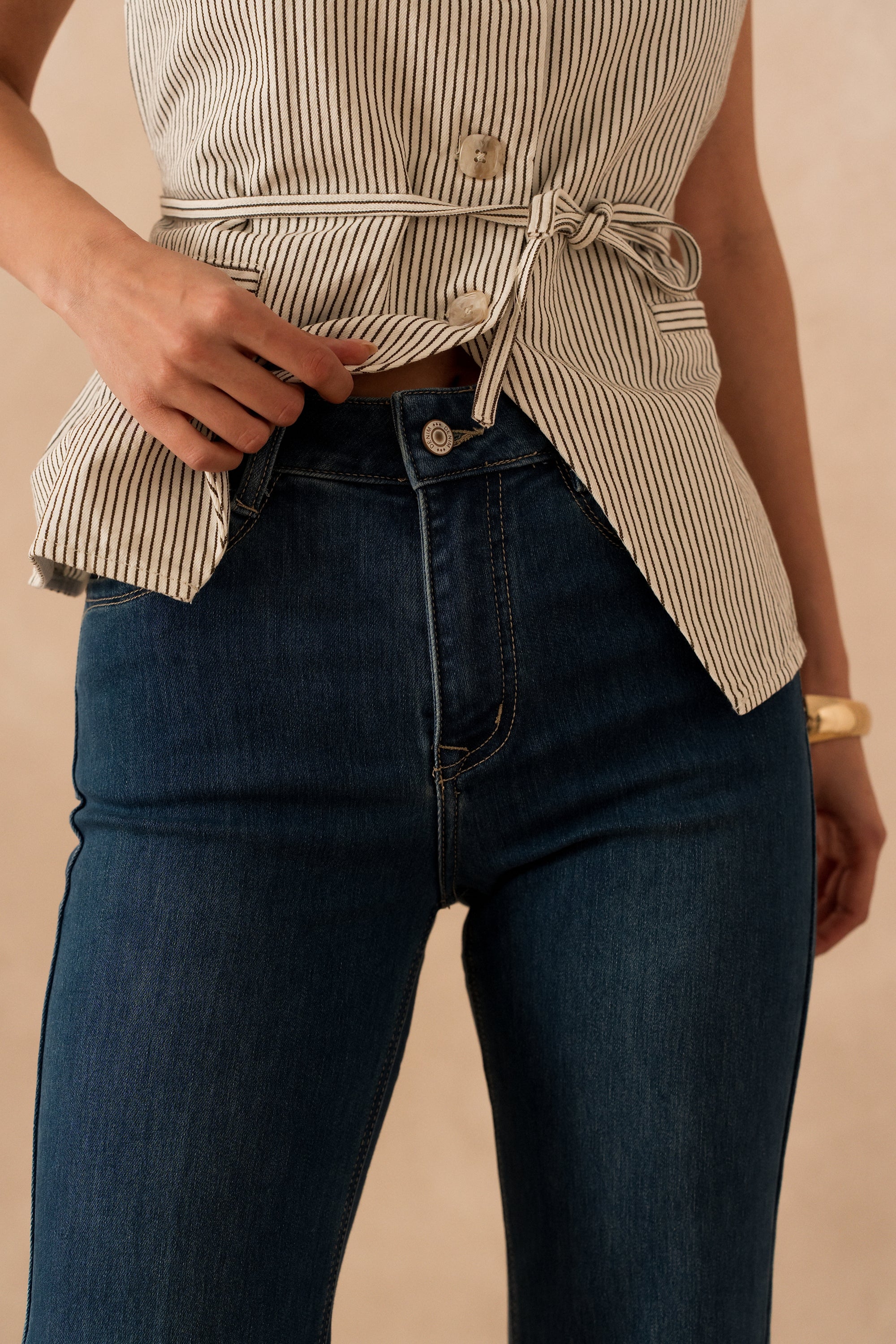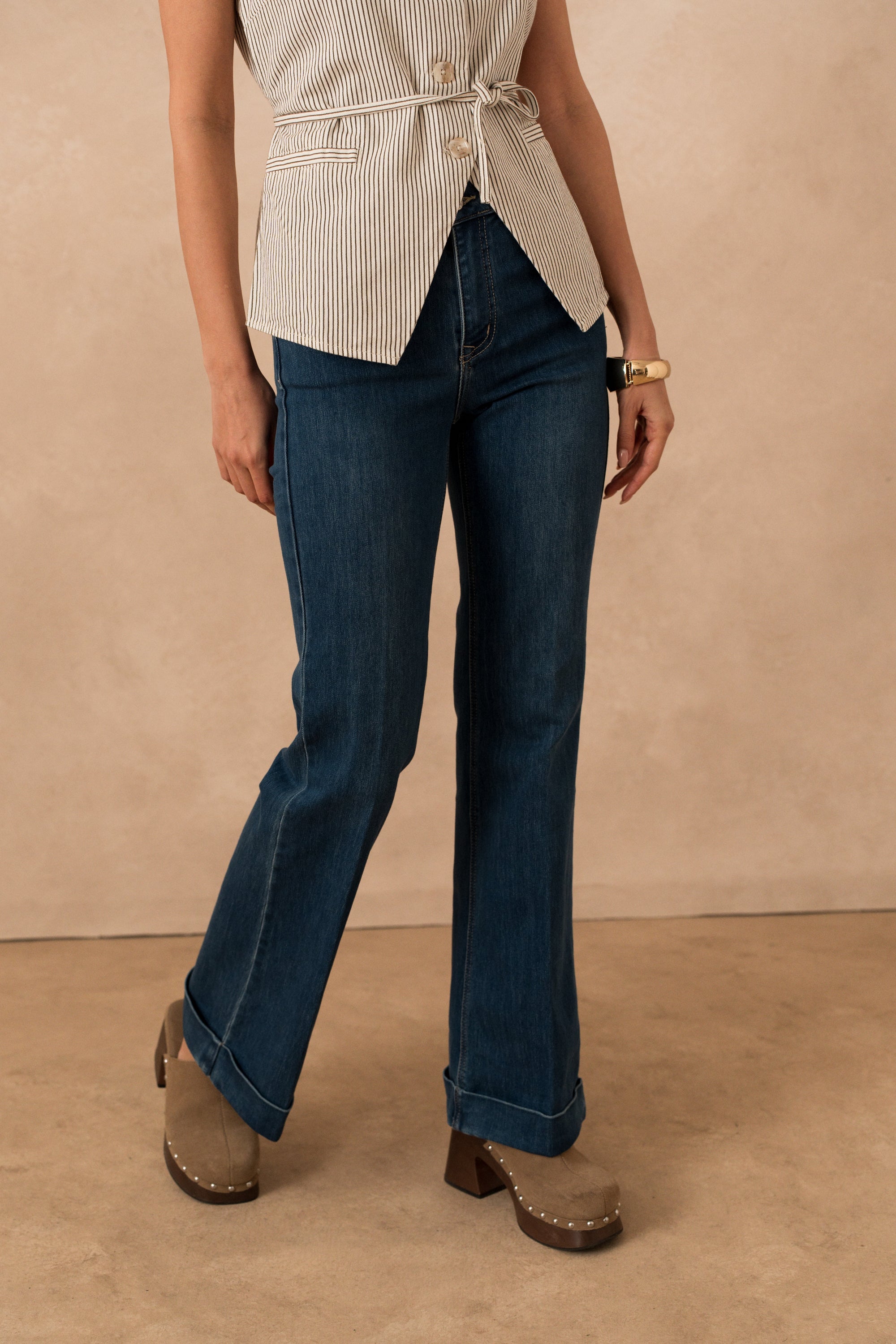 Today, the Fanny jean hasn't changed, we still love it for its very vintage flare cut, its semi-high waist which hides small imperfections around the stomach and especially its large hems which are both very sevent and very chic which make it the perfect pair of pants for going to the office.