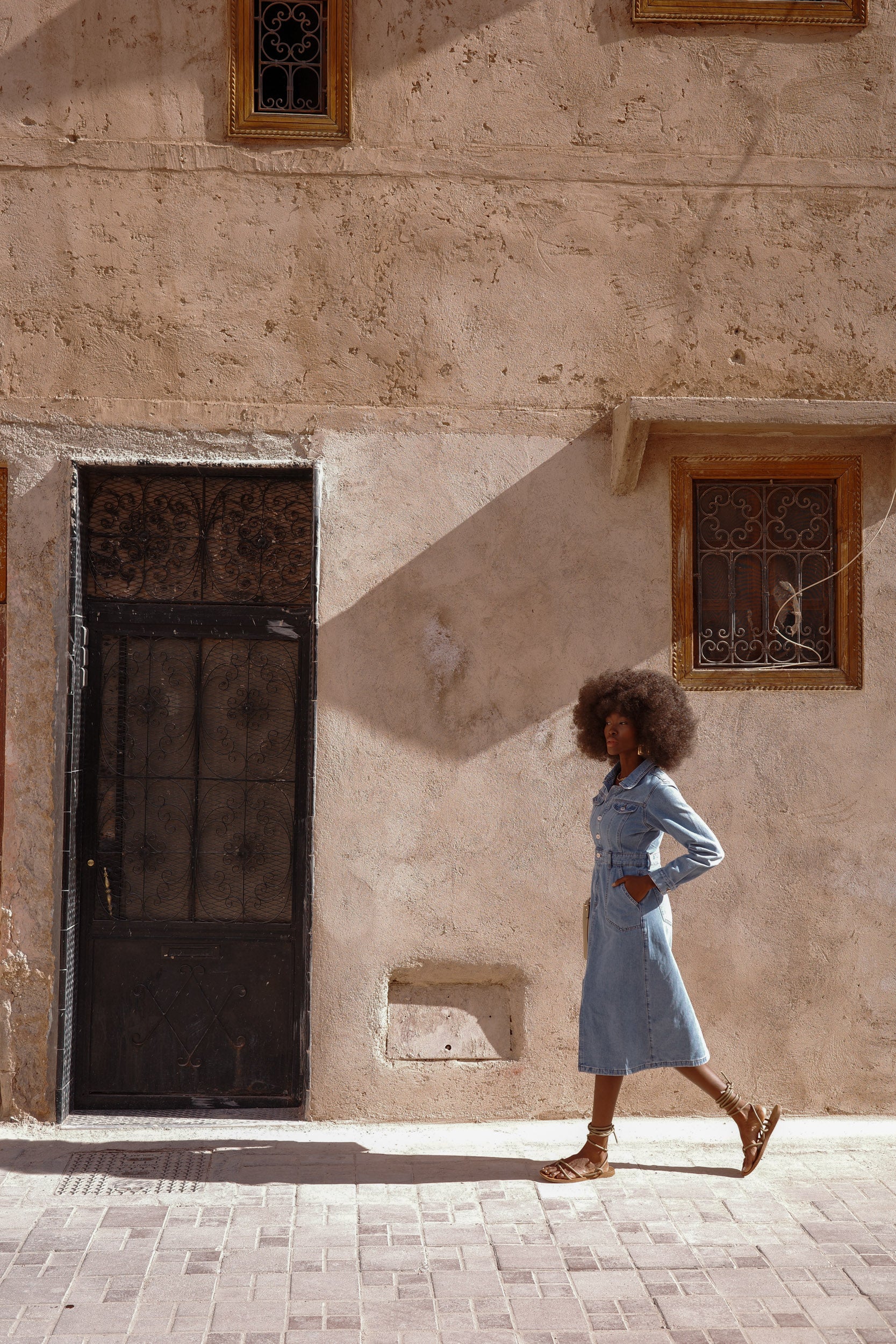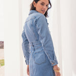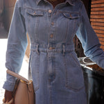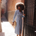 Give yourself the confidence of a femme fatale with the Ophélie dress. This dress is the perfect blend of a denim jacket and a denim pencil skirt: in other words, the perfect blend of elegance and comfort.