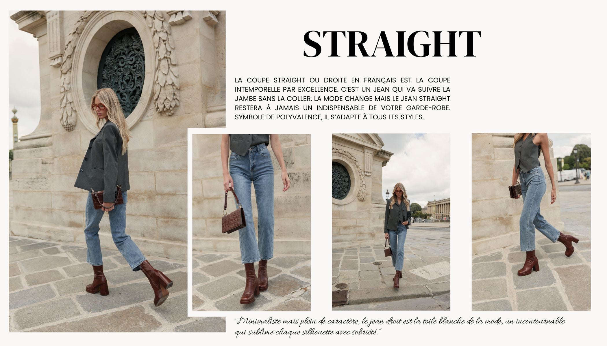 Même si d'autres coupes ont pris le devant de la scène pour le moment (comme le wide ou le flare), le jean straight est toujours présent et traverse les années sans jamais se démodé il est le jean intemporel par excellence.