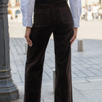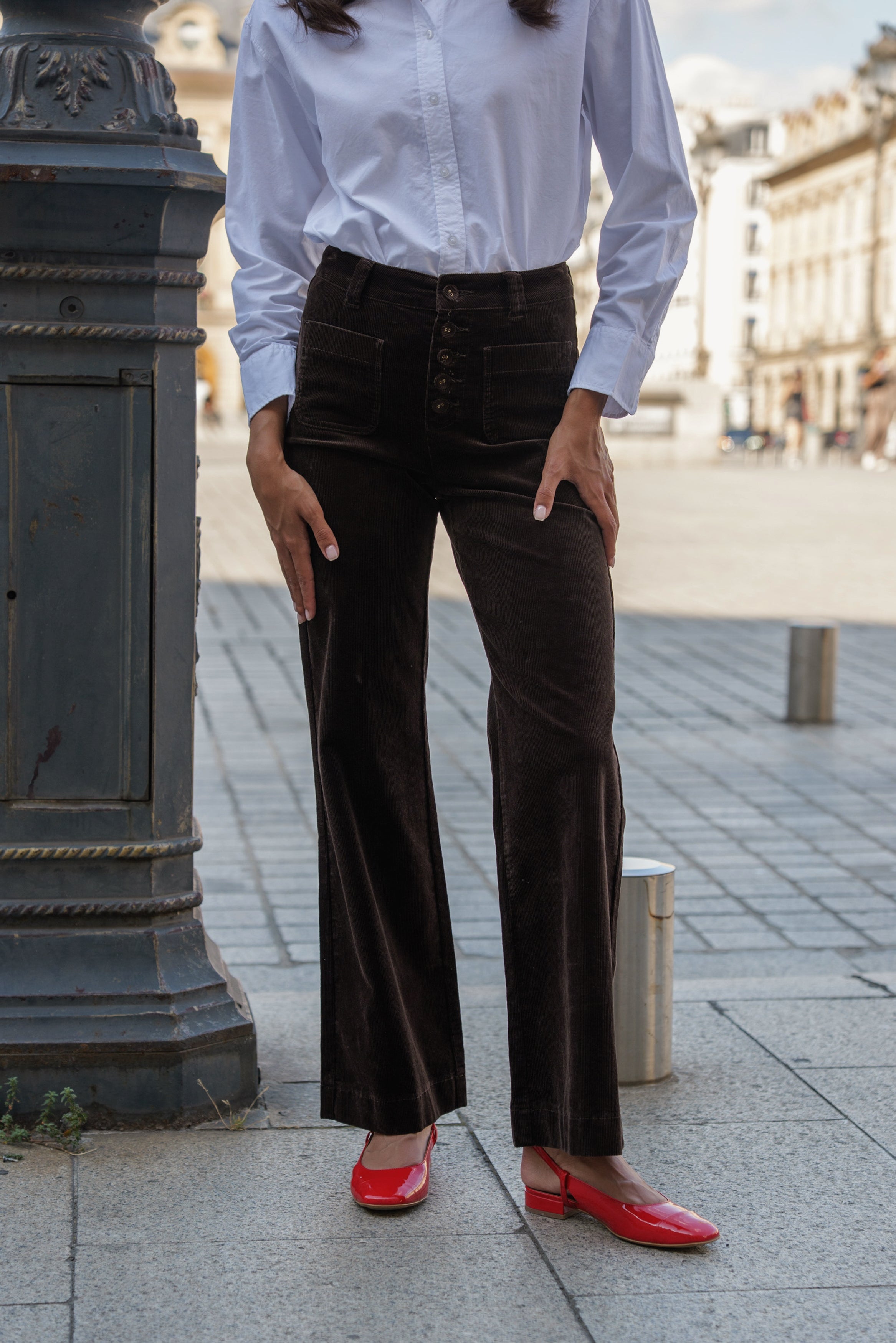 Découvrez notre pantalon Viviane, ce pantalon en velours avec une coupe wide. C'est une coupe qui va être cintré à la taille puis qui va s'évaser jusqu'en bas de jambes. C'est la coupe à adopter pour élancer votre silhouette.